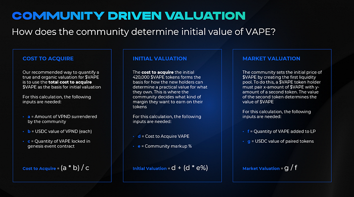 Having and establishing an objective and public cost to acquire is a huge part of a healthy community driven valuation — because it informs what the logical floor value for VAPE should be. If the community collectively surrendered 50K USDC worth of VPND for 420K VAPE tokens — it tells us that in total, the community gave up $0.119 worth of VPND for every 1 VAPE token they received.
