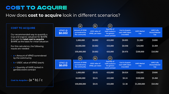 The graphic above shows several hypothetical scenarios and how the price of VPND, combined with the amount of VPND surrendered during the event — can be used to calculate the cost to acquire the initial 420K supply of VAPE tokens.